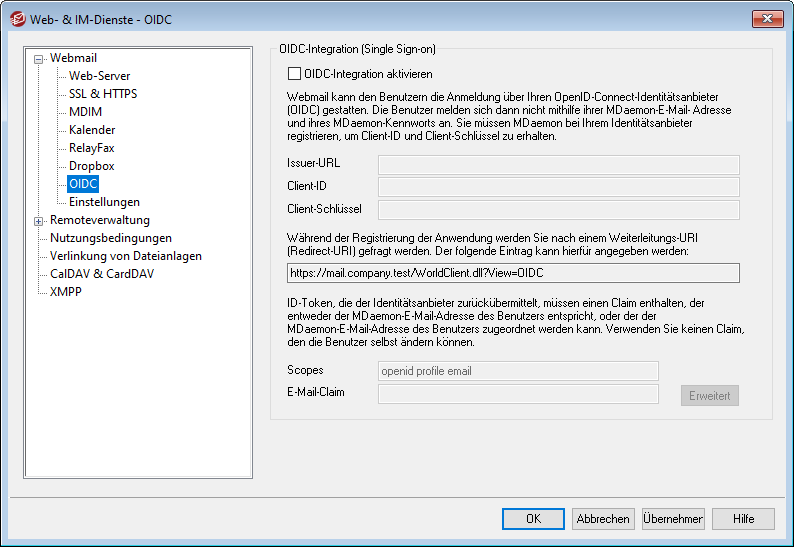 Bei der Registrierung Ihrer OIDC-App bei Ihrem Identitätsanbieter müssen Sie einen Weiterleitungs- oder Redirect-URI angeben. Dieser Redirect-URI wird auch als Umleitungs-URI bezeichnet. Der Redirect-URI, der hier angezeigt wird, wird aus dem SMTP-Hostnamen der Standard-Domäne erstellt. Ein Beispiel hierzu: https://mail.example.com/WorldClient.dll?View=OIDC