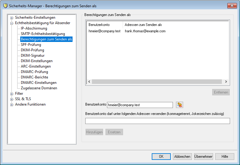 Benutzerkonten dürfen per Voreinstellung E-Mail-Nachrichten nur unter ihren eigenen E-Mail-Adressen und Alias-Adressen senden. Sie können jedoch Benutzerkonten in MDaemon die Berechtigung erteilen, Nachrichten unter den E-Mail-Adressen anderer Benutzerkonten zu versenden. Hierzu dient dieser Konfigurationsdialog. Einige Beispiele hierzu: Sie können der Assistenz einer Führungskraft die Berechtigung erteilen, E-Mail-Nachrichten so zu versenden, wie wenn sie durch das Benutzerkonto der Führungskraft selbst versandt worden wären. Sie können auch allen Benutzern einer Domäne die Berechtigung erteilen, unter einer bestimmte E-Mail-Adresse Nachrichten zu versenden. Hierzu verwenden Sie Jokerzeichen in den E-Mail-Adressen, wie etwa "*@example.com" für die betroffene Domäne und "info@example.com" für die E-Mail-Adresse, unter der Nachrichten versandt werden dürfen. Um einem Benutzerkonto die Berechtigung zum Senden unter einer abweichenden E-Mail-Adresse zu erteilen, wählen Sie in diesem Konfigurationsdialog das betreffende Benutzerkonto aus, und geben Sie dann die Adressen an, unter denen das Benutzerkonto versenden darf. Der Versand unter den angegebenen E-Mail-Adressen wird dann nicht durch die Optionen "Anmeldedaten müssen mit der Adresse aus dem Antwortpfad übereinstimmen" und "Anmeldedaten müssen mit der Adresse aus der Absenderkopfzeile 'From:' übereinstimmen" im Konfigurationsdialog SMTP-Echtheitsbestätigung verhindert.