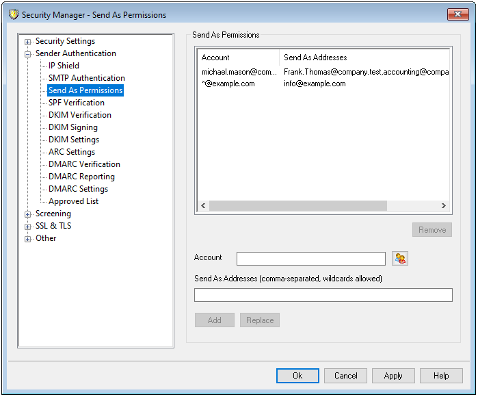 Di norma, gli account possono inviare posta solo dal proprio indirizzo e-mail o dai propri alias. Se, tuttavia, vi sono account MDaemon che si desidera autorizzare a "inviare come" altri account, utilizzare questa pagina per impostarli. Ad esempio, si può dare all'assistente di un manager l'autorizzazione a inviare messaggi come se provenissero dall'account del manager, oppure si può utilizzare un indirizzo jolly, come "*@example.com", per dare a tutti gli utenti di un dominio specifico l'autorizzazione a inviare da un indirizzo specifico, come "info@example.com". A tale scopo, è sufficiente utilizzare le opzioni di questa pagina per selezionare l'account e quindi elencare gli indirizzi di invio come da cui tale account potrà inviare messaggi. In questo modo gli account designati potranno inviare la posta da questi indirizzi, invece di essere bloccati dai requisiti "Le credenziali utilizzate devono corrispondere a quelle dell'indirizzo del percorso di ritorno" e "Le credenziali utilizzate devono corrispondere a quelle dell'indirizzo dell'intestazione 'Da:'" nella schermata Autenticazione SMTP.